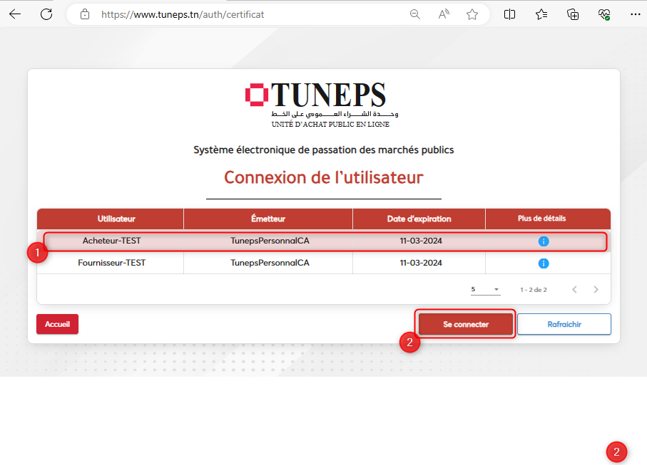 Choisir le certificat puis cliquer sur « Se connecter »
