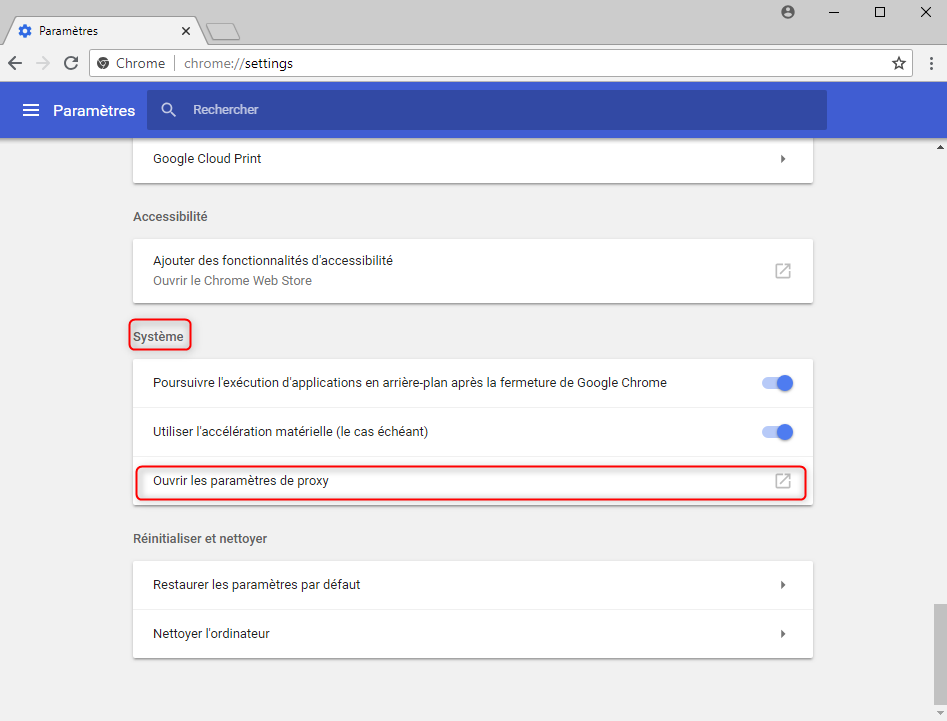 - Cliquer sur « Ouvrir les paramètres de proxy »