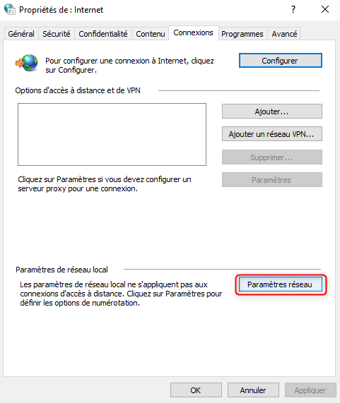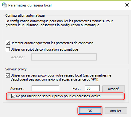 - Cocher « Ne pas utiliser de serveur proxy pour les adresses locales »