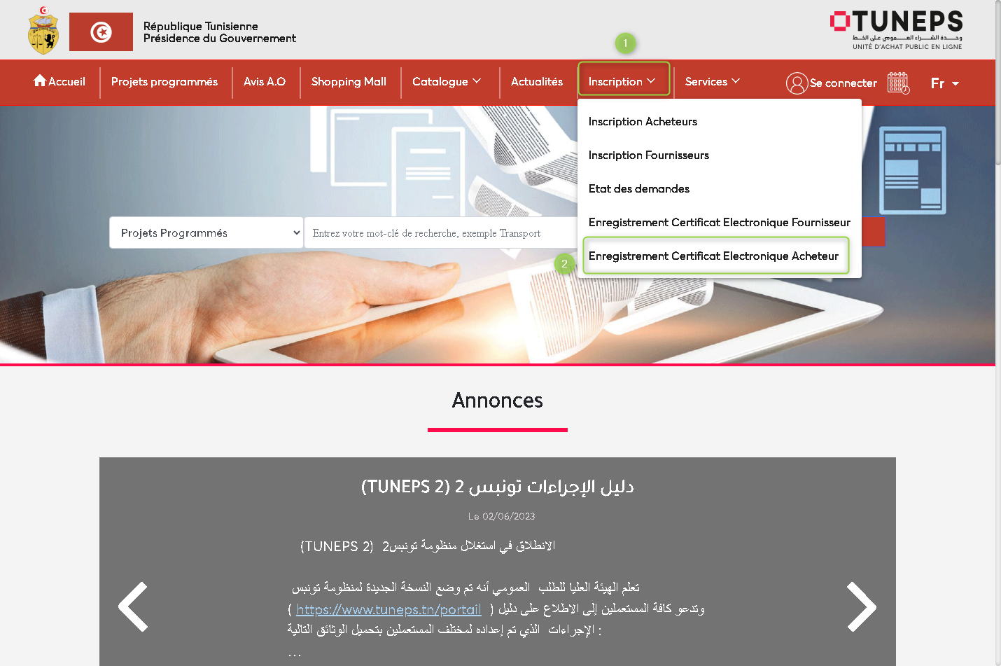 - Cliquer sur « Enregistrement Certificat Electronique Acheteur»