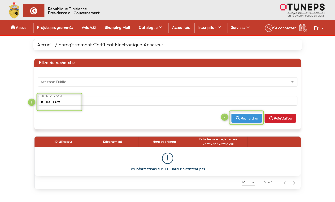 Pour identifier et authentifier le certificat, il est indispensable de saisir le code de l’acheteur public ainsi que le numéro de la carte d’identité de l’utilisateur.