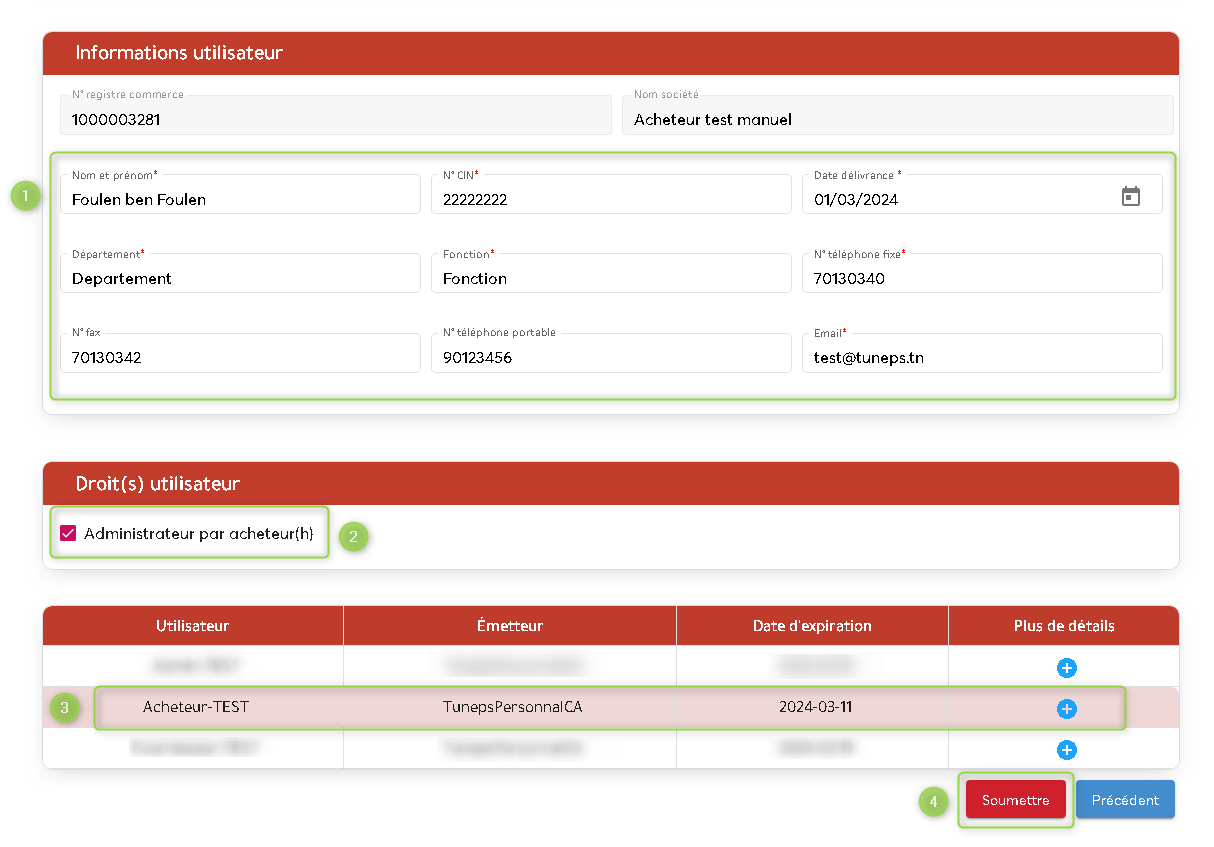 - Cocher la case « administrateur par acheteur » si vous êtes le responsable de la gestion des certificats et des identifiants des autres utilisateurs chez le même acheteur.