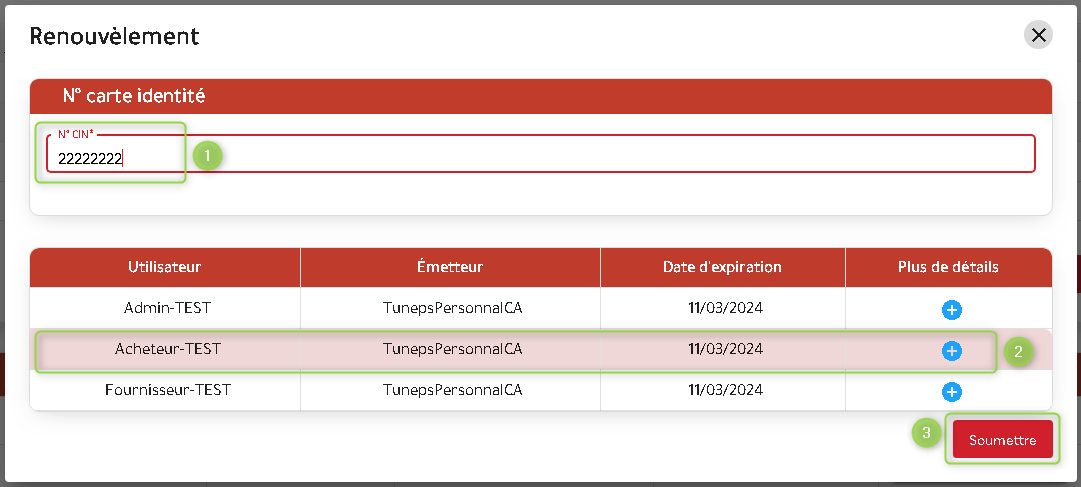- Saisir le numéro de la carte d’identité nationale de l’utilisateur ayant le certificat supplémentaire.