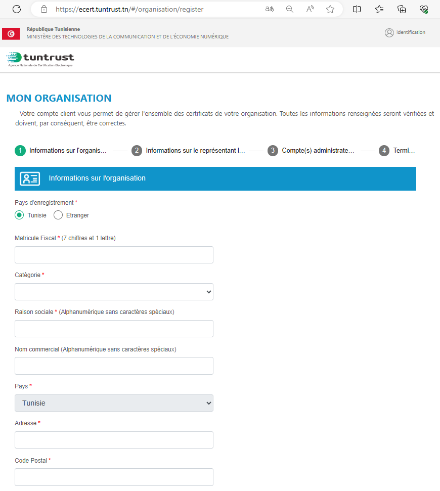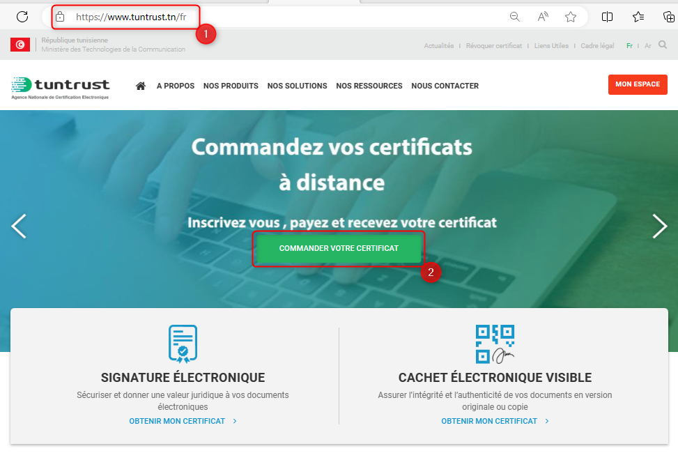 Consulter https://ecert.tuntrust.tn/#/organisation/register et commander votre certificat en ligne